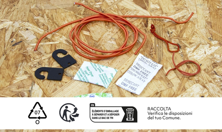 Viel ist es nicht, aber alles, was von der Verpackung jetzt noch übrig ist, gehört in den Restmüll. Zum Beispiel die Nylonschnur und der schwarze Haken des Hänge-Etiketts oder die elastische Schnur, die das Produkt auf dem Pappaufhänger an Ort und Stelle hält. Falls eines der kleinen Silica Gel-Beutelchen gegen Feuchtigkeit dabei ist, gehört dieses ebenfalls in den Restmüll.
