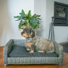 Der Let's Sleep Cozy Basket besteht aus einem herrlich luxuriösen Korb aus geflochtener Weide und einem passenden Kissen. Das Kissen hat eine weiche, aber dennoch feste Füllung, sodass man bequem darauf liegen kann und es gleichzeitig stützend wirkt. Ihr Hund kann in das Kissen einsinken und der Korb bietet eine angenehme Rückenstütze. Die Beine des Korbs sind gummiert, damit er nicht so leicht verrutscht und die Gefahr von Kratzern auf dem Boden minimiert wird.