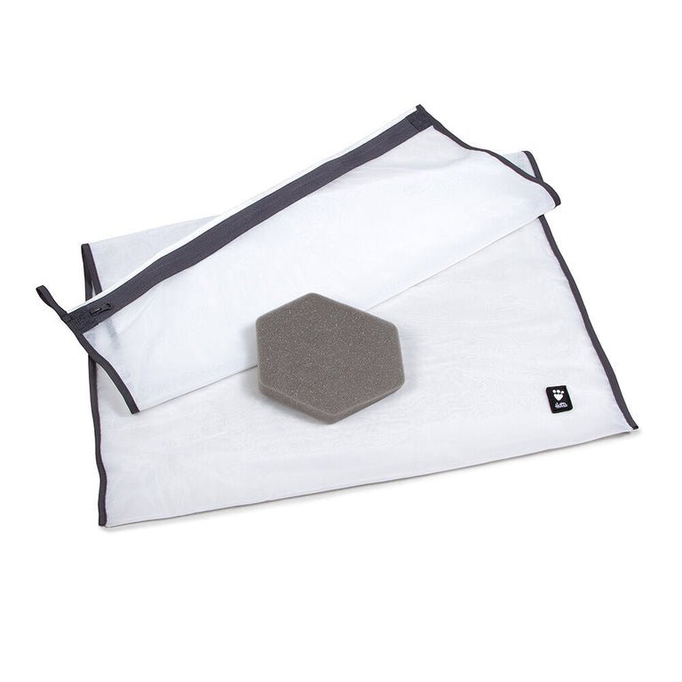 Ein cleveres kleines Stück Schaumstoff, das dem Waschbeutel beiliegt, hilft ausserdem, Hundehaare aus der Waschmaschine fernzuhalten. Es kann entweder in den Waschbeutel oder in die Waschmaschine gelegt werden. Während des Waschgangs fängt der Schaumstoff lose Hundehaare auf.