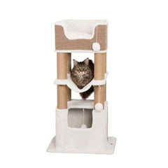 Trixie Kratzbaum Lucano in Weiss/Taupe ist ein extragrosser Kratzbaum für grosse Katzen, mit zwei Verstecken, Kissen und einem Liegekorb. Auch grössere Katzen haben auf diesem modernen Kratzbaum von Trixie viel Platz. Der Scratch Post Lucano ist ein XXL-Kratzbaum, der auch für grössere Katzenrassen wie Maine Coons und Waldkatzen geeignet ist. Der Kratzbaum ist mit extragrossen Verstecken ausgestattet, die komplett mit Plüsch ausgekleidet sind und über bequeme, wendige Kissen verfügen. Die Katze kann auch in der Mitte auf dem extra Liegekorb sitzen. Kratzen Sie nach Herzenslust auf den Jute-Kratzflächen und den mit Jute bezogenen Kratzstämmen. Zum Schluss sind am Kratzbaum noch einige Plüschbälle zum Spielen angebracht.