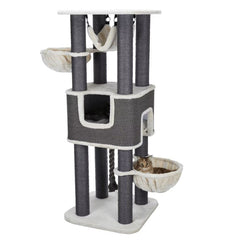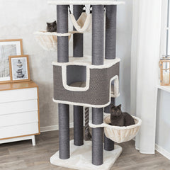 Besonders geeignet für grosse Katzen, verfügt dieses Produkt über einen hochwertigen Plüschbezug aus Polyester, mit Stämmen, die in natürlichem Sisal gewickelt sind. Es hat eine dicke, schwere Bodenplatte und eine abnehmbare Hängematte, die gepolstert und gesteppt ist und von Hand gewaschen werden kann.