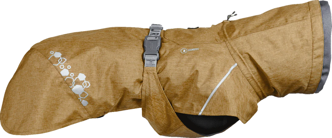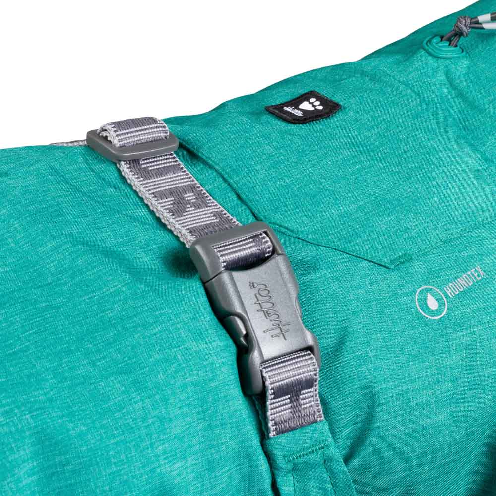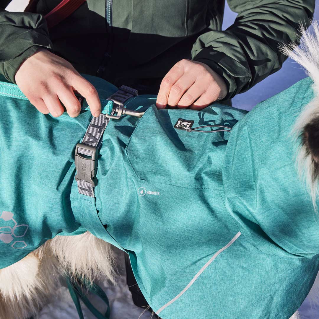 Trotz seines robusten Schutzes vor nassem Wetter lässt sich der Monsoon Coat ECO dank des verstellbaren Hurtta-Gurtbandes und der Schnellverschlussschnalle besonders einfach an- und ausziehen. Der diskret platzierte Rückenlängenversteller auf der Innenseite des Regenmantels ist eine Neuerung, die den Mantel noch wasserdichter macht und ein Verheddern der Kordel verhindert.