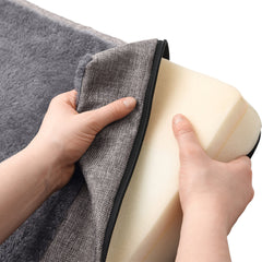 Ein erholsamer Schlaf ist für Hunde ebenso wichtig wie für Menschen. In ungeeigneten Betten kann es, vor allem bei älteren Hunden und Hunden mit Gelenkproblemen, zu Schmerzen und Verspannungen kommen. Die orthopädische Hundematte TIRANO verteilt Dank der druckentlastenden Memoryschaum-Matte optimal das Gewicht des Hundes und entlastet somit den gesamten Körper. Auch Hunde, die sportlich besonders viel leisten oder Welpen, bei denen man präventiv tätig sein möchte, sind dankbar für TIRANO. Die bequeme Hundematte kann einzeln oder auch als Einlage, wie zum Beispiel in Hundeboxen, verwendet werden. Während der angenehme Struktur-Stoff der Matte einen eleganten Look verleiht, punktet die Liegefläche mit wärmenden, anschmiegsamen Plüschbesatz. Der robuste und pflegeleichte Bezug lässt sich Dank Reissverschluss komplett abnehmen und bei 30 °C waschen. Hinweis: Bitte vor dem Waschen den Reissverschluss schliessen.